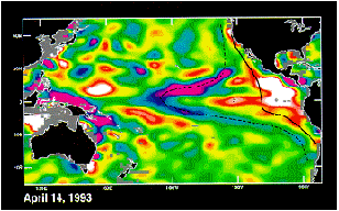 From the TOPEX/Poseidon satellite. Besides showing Rossby and Kelvin waves generated by ENSO, it's a pretty cool pic. | ||||||||||||||||